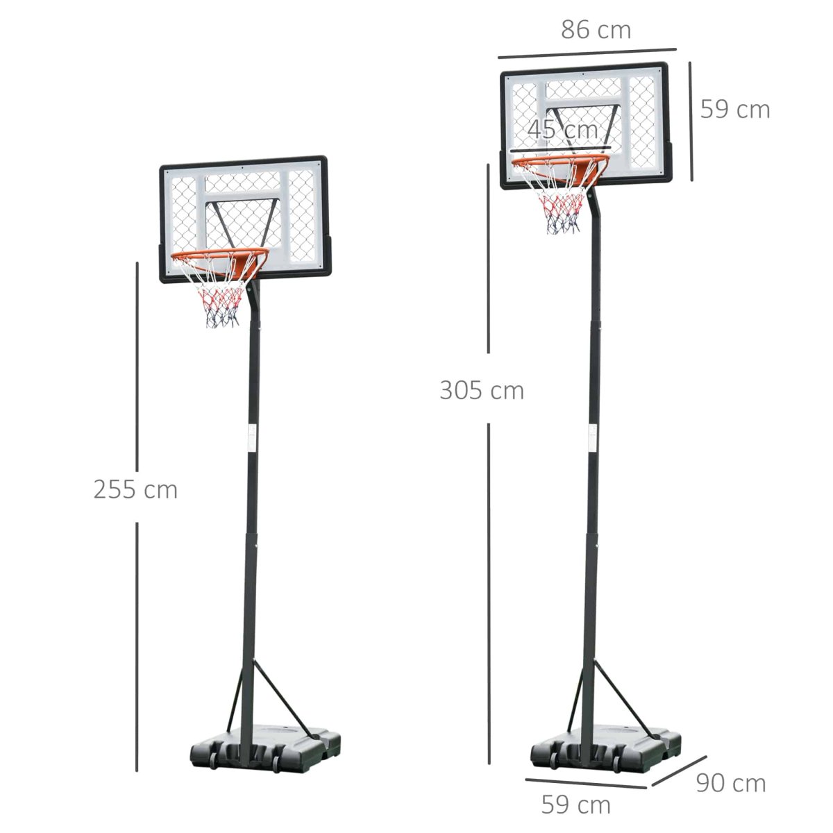 Totale afmetingen: 86 cm breed x 153 cm diep x 250-350 cm hoog. De afmetingen van de achterwand zijn 86 cm breed x 59 cm hoog. Met deze basketbalstandaard haal je een kwalitatief hoogwaardig product in huis dat zorgt voor urenlang speelplezier voor het hele gezin. De verstelbare hoogte, stabiele basis en mobiliteit maken deze standaard een must-have voor elke basketbalfan.