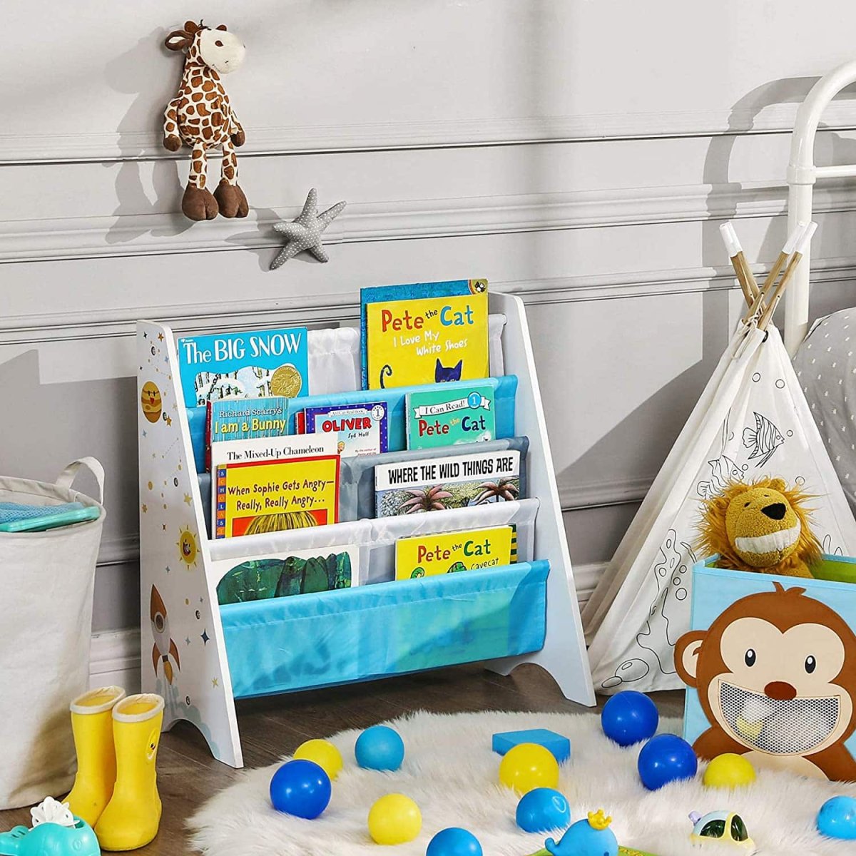 – Snelle montage: de montage van dit boekenrek voor kinderen is in een mum van tijd gedaan. Schuif gewoon de stangen in de openingen van de stofbaan en bevestig ze daarna aan het zijframe. Klaar!