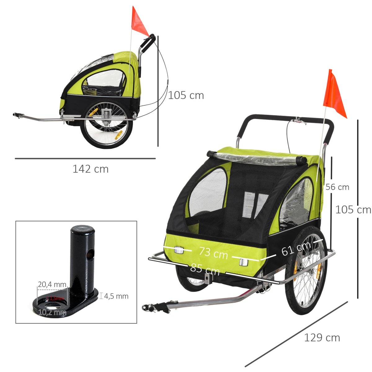 Met de inbegrepen regenhoes en klamboe zijn je kinderen beschermd tegen regenachtig weer en vervelende insecten. Een vlag zorgt voor extra zichtbaarheid en de twee 5-puntsgordels zorgen voor een veilige rit voor je kinderen.