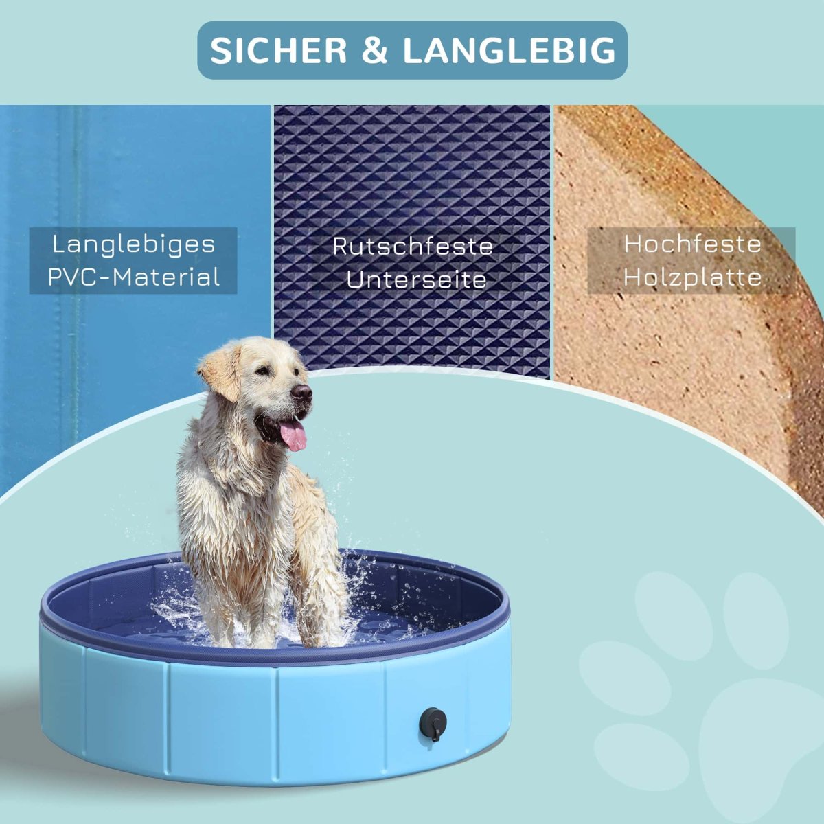 Dit hondenzwembad is gemaakt van robuust en sterk materiaal, wat zorgt voor een lange levensduur en stabiliteit tijdens het gebruik. Dankzij de praktische waterafvoerklep kan het zwembad eenvoudig worden geleegd na gebruik. De stabiele grensversterking zorgt ervoor dat het zwembad stevig blijft staan, zelfs tijdens het ravotten van enthousiaste honden.