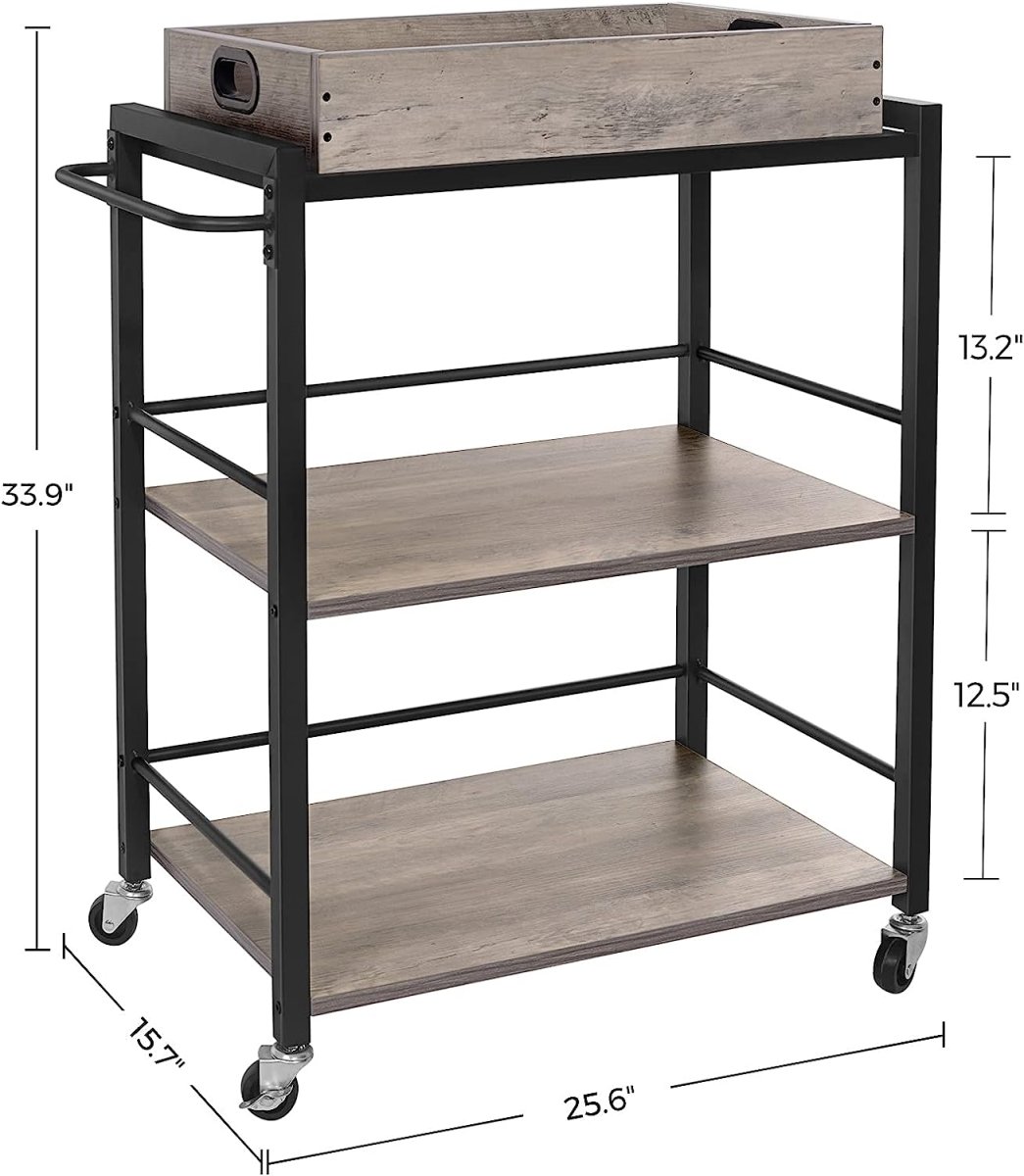 Deze keuken serveerwagen met verwijderbare lade is een 3-laags keukenwagen op wielen met opslag. Deze keukenwagen is perfect voor het organiseren en opslaan van al uw keukengerei. Het is gemaakt van stevig metaal en heeft een stijlvolle grijs en zwarte afwerking.