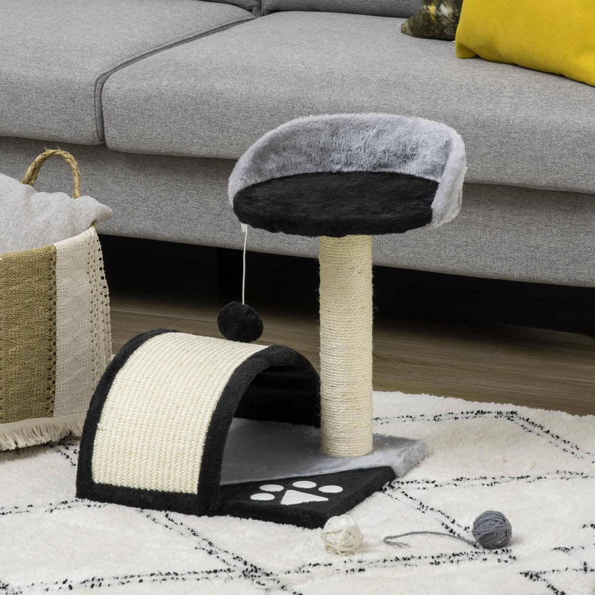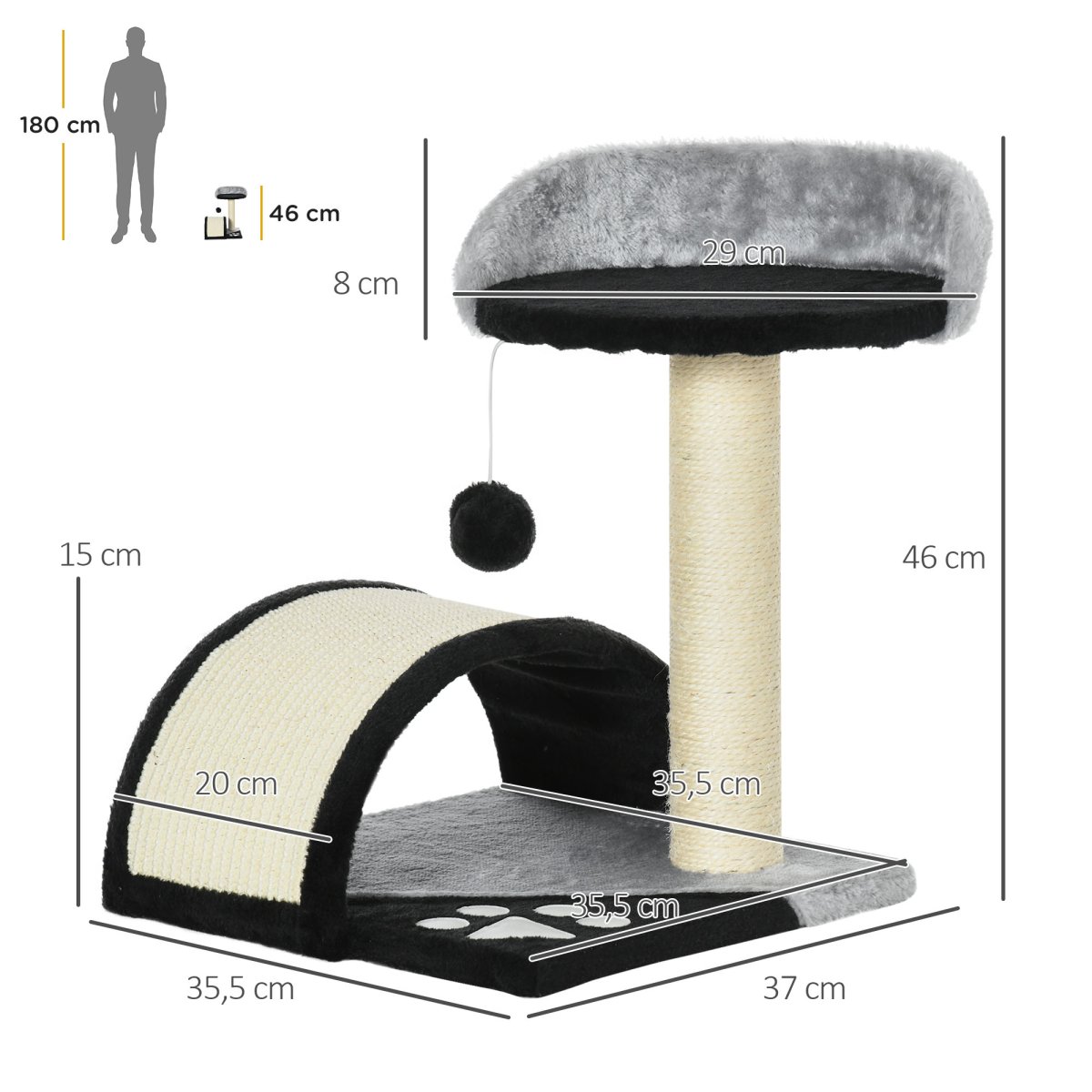 De krabpaal is vervaardigd uit kwaliteitsmaterialen en heeft een elegante zwarte kleur die moeiteloos past in elk interieur. Het is gemaakt van milieuvriendelijke materialen en is geschikt voor katten tot 4 kg.