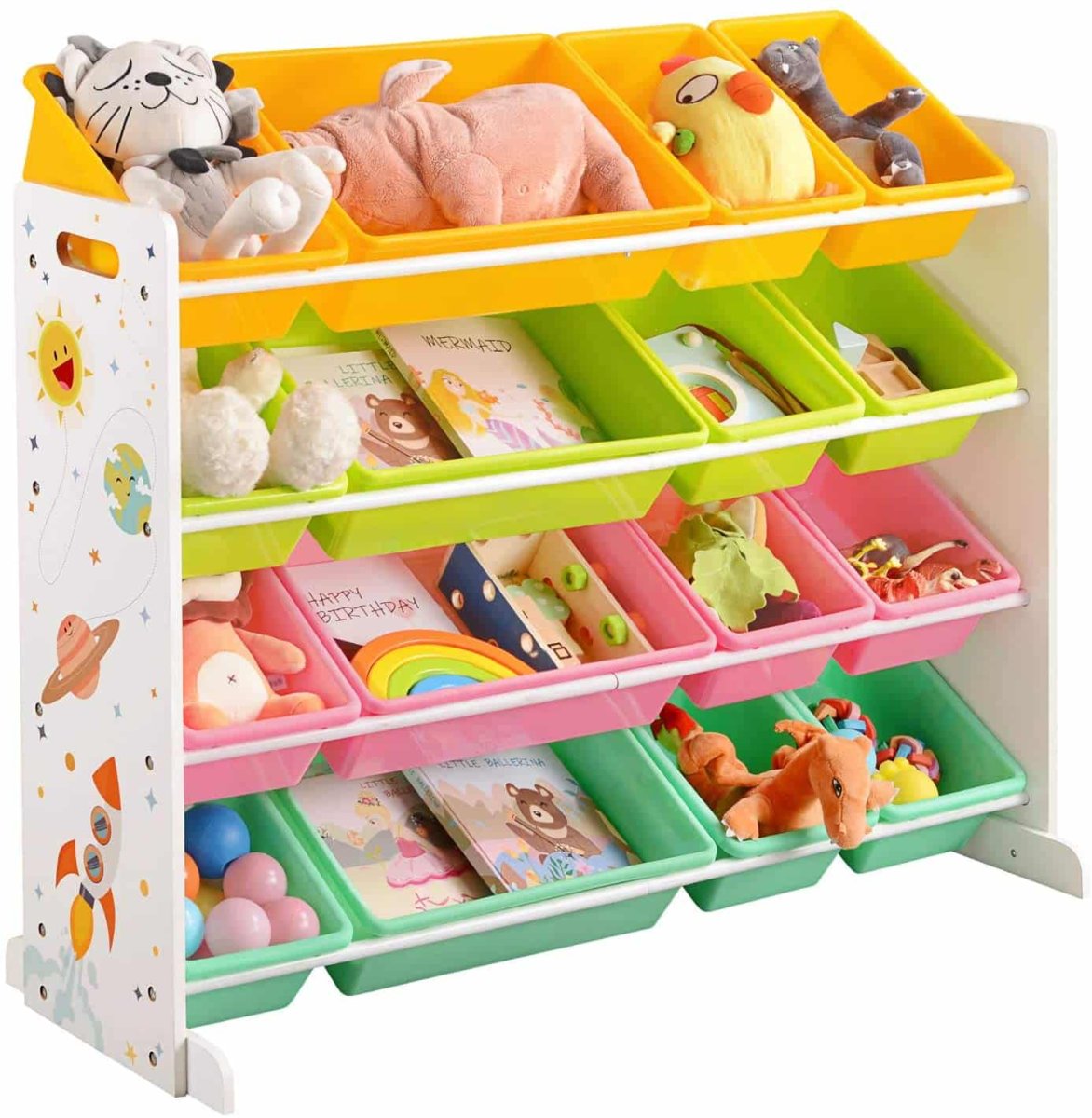 – WAT JE KRIJGT: een speelgoedplank met 16 dozen voor kinderen om de kamer op te ruimen, kindvriendelijk ontwerp voor veilig gebruik en een mooie uitstraling die de kinderkamer levendiger zal maken