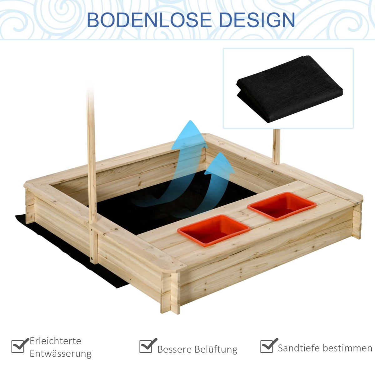 - Stofbekleding: De zandbak is voorzien van een stoffen bekleding aan de onderkant, waardoor waterafvoer en ventilatie makkelijker worden. Hierdoor kun je ook de diepte van het zand aanpassen naar wens van de kinderen.